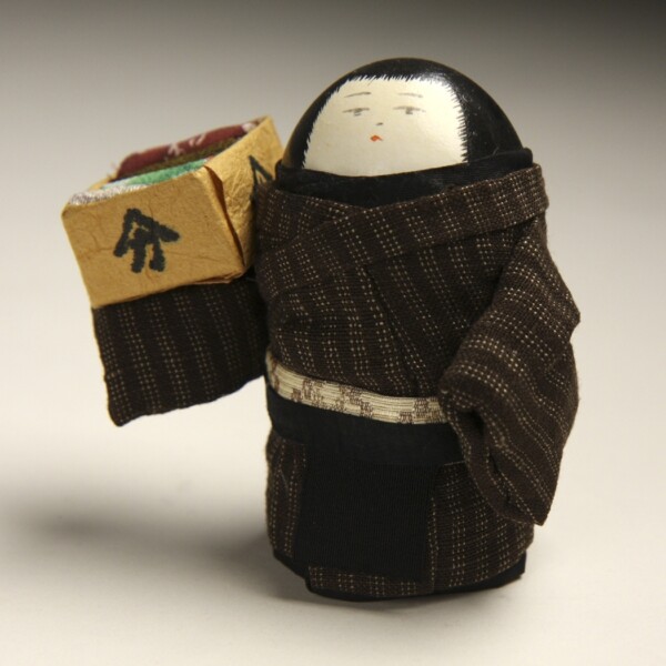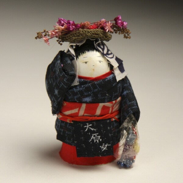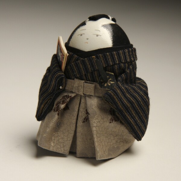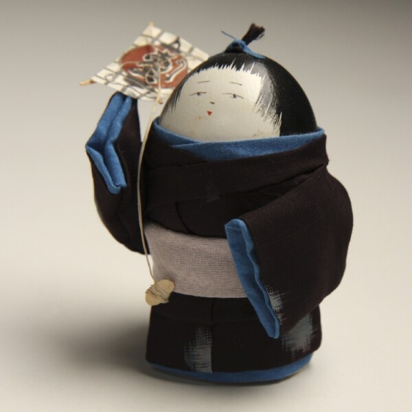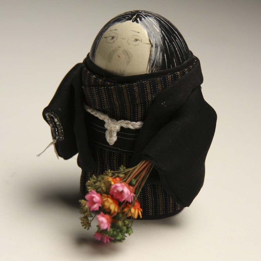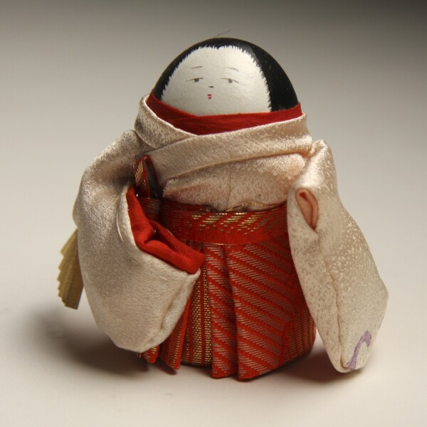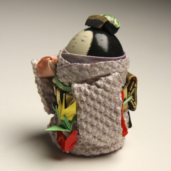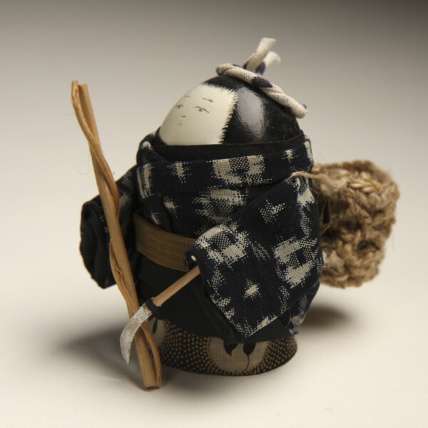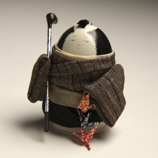 For her dolls Yoshiko Teraoka used treasured old fabric from the kimono store that she and her husband owned in Onomichi in the Hiroshima area. Colorful characters in her family and the vivid stories they told inspired her egg dolls. Yoshiko Teraoka came from a family with artistic tradition, and she was the mother of famed artist, Masami Teraoka. One source of his wry sense of humor is clearly revealed in these dolls.