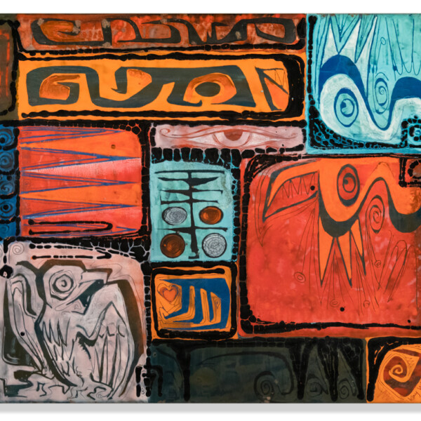 Abstract enamel on copper wall panels, such as this one, characterize the later work of San Diego native Ellamarie Woolley.
