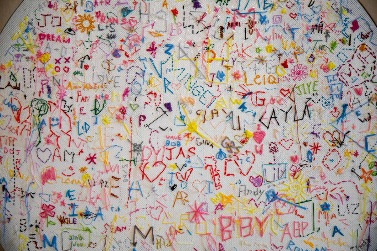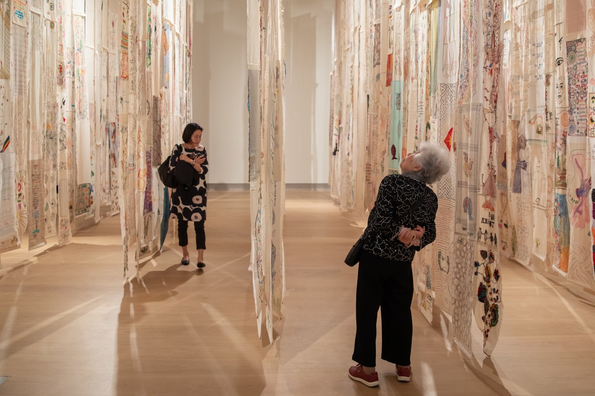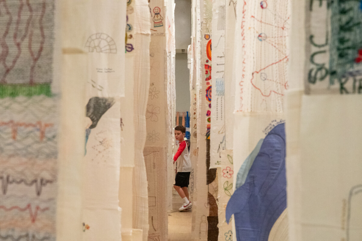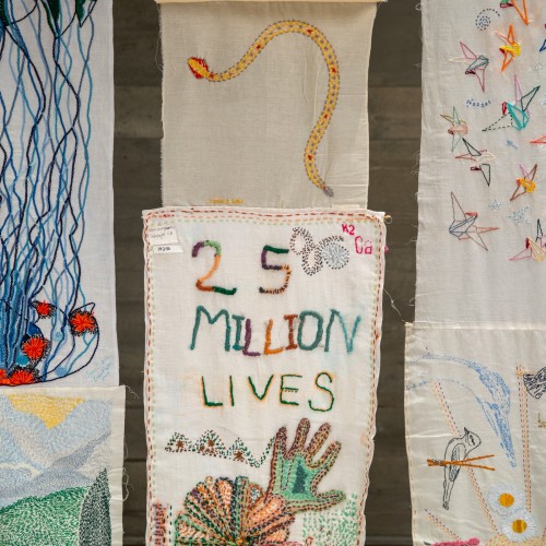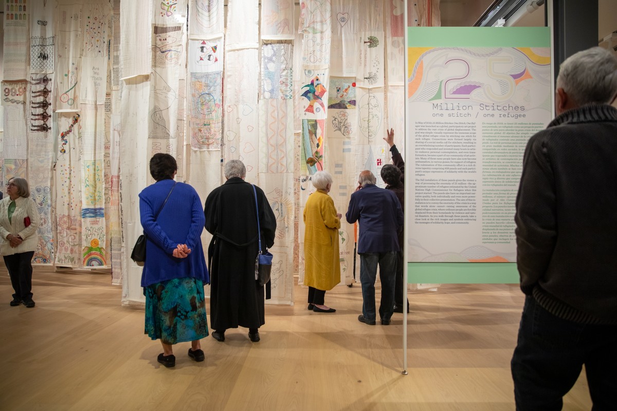25 Million Stitches: One Stitch, One RefugeeIn this exhibition, guest curator and fiber artist Jennifer Kim Sohn looks for a way to make the unfathomable figure of refugees around our world more tangible by marking a displaced person with panels of hand-sewn stitches.