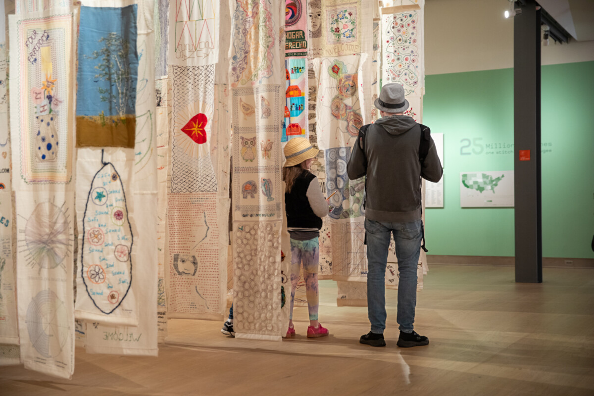 Each panel is unique, some documenting personal narratives, others showing solidarity with the refugees. Kim Sohn and her passionate team of volunteers crowd-sourced 2,300 stitchers from all 50 states and 37 countries worldwide.