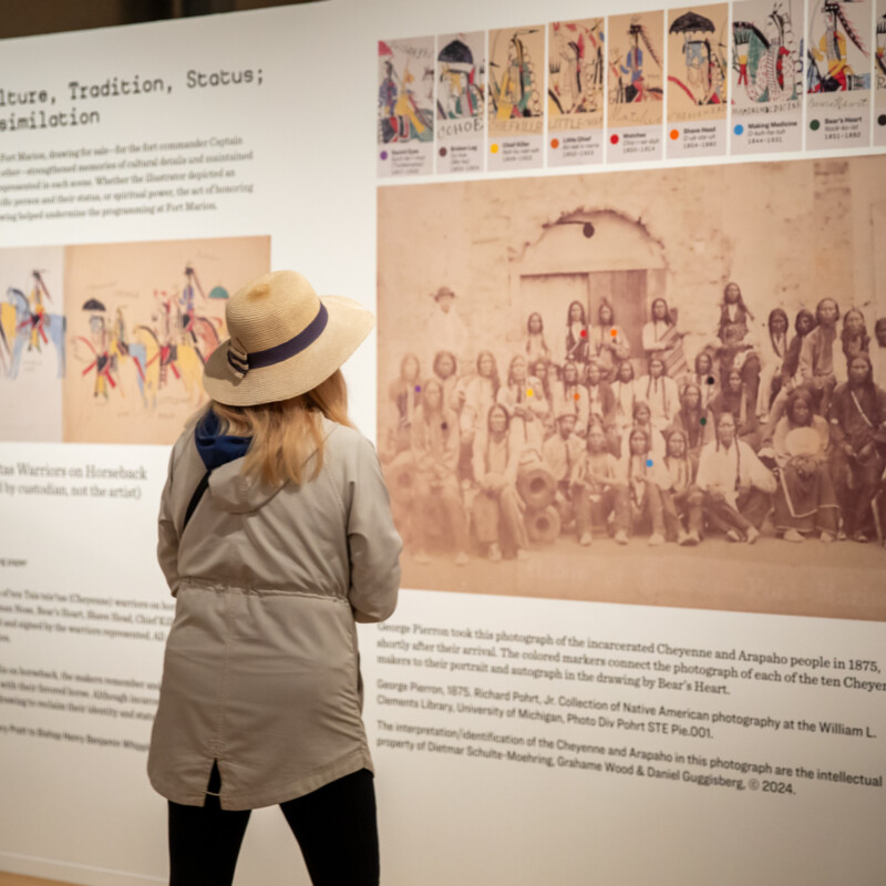 The mid-to-late 1800s was a period of armed and violent Anglo expansion into Native American territories in the Southern Plains of the United States. In 1875, a group of 73 Native Americans were singled out from warriors that surrendered to the U.S. army. The captives, 1 woman and 72 men from the Cheyenne, Arapaho, Kiowa, Comanche, and Caddo tribes, were incarcerated without trial at Fort Marion, a historic fort in St. Augustine, Florida. During their imprisonment, efforts to “educate” and “civilize” the captives included the provision of paper and pencils for drawing.