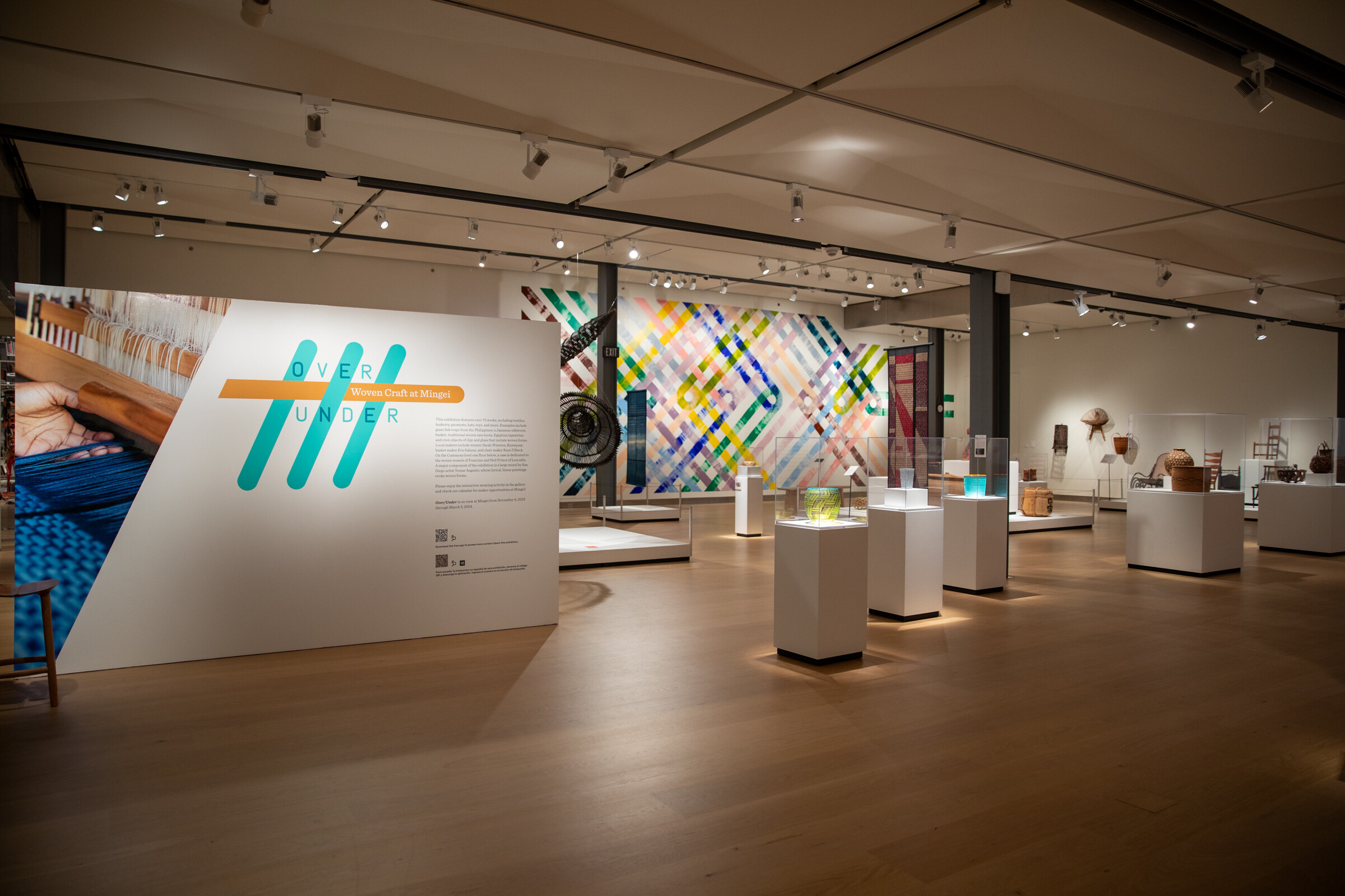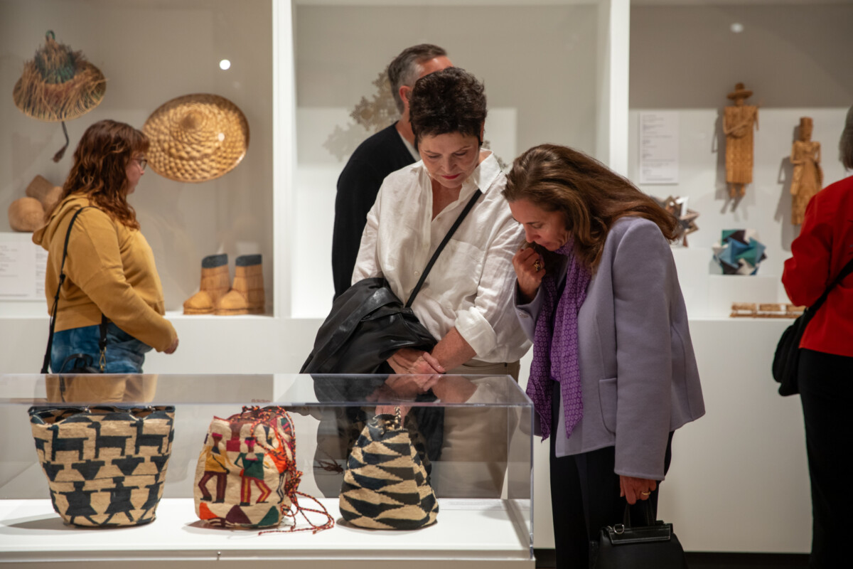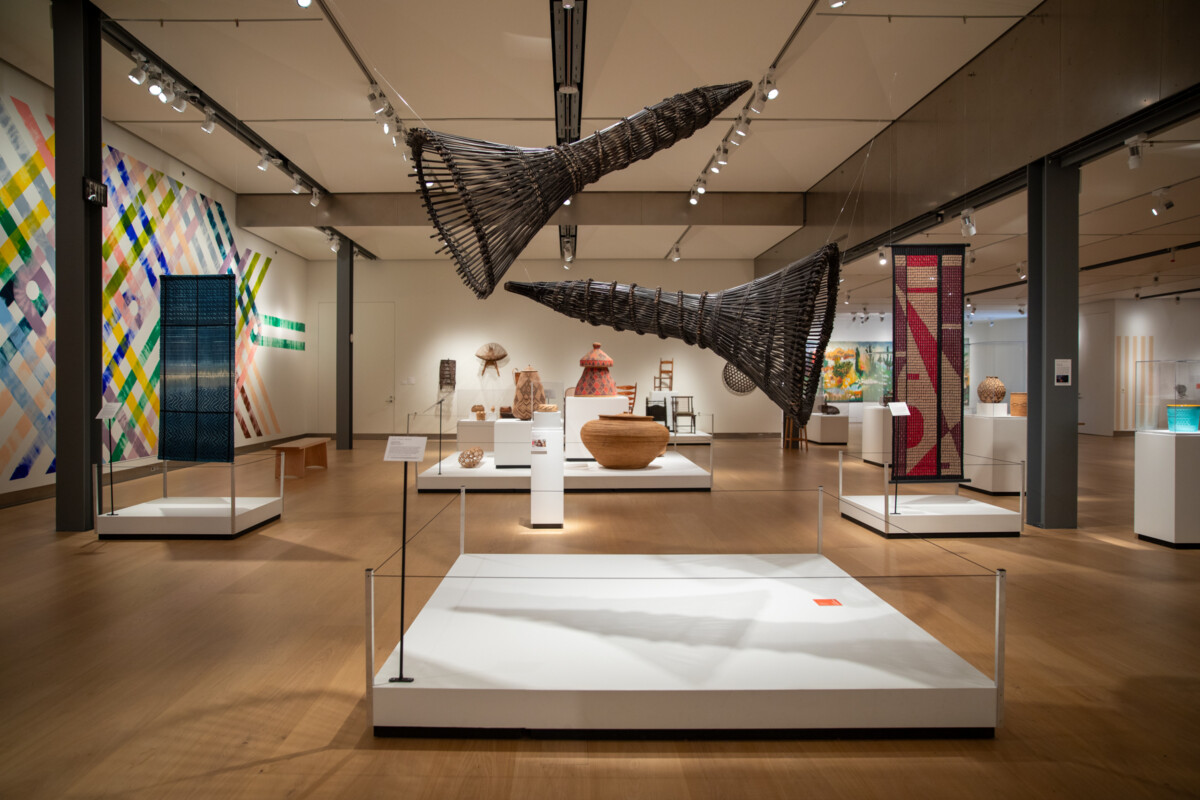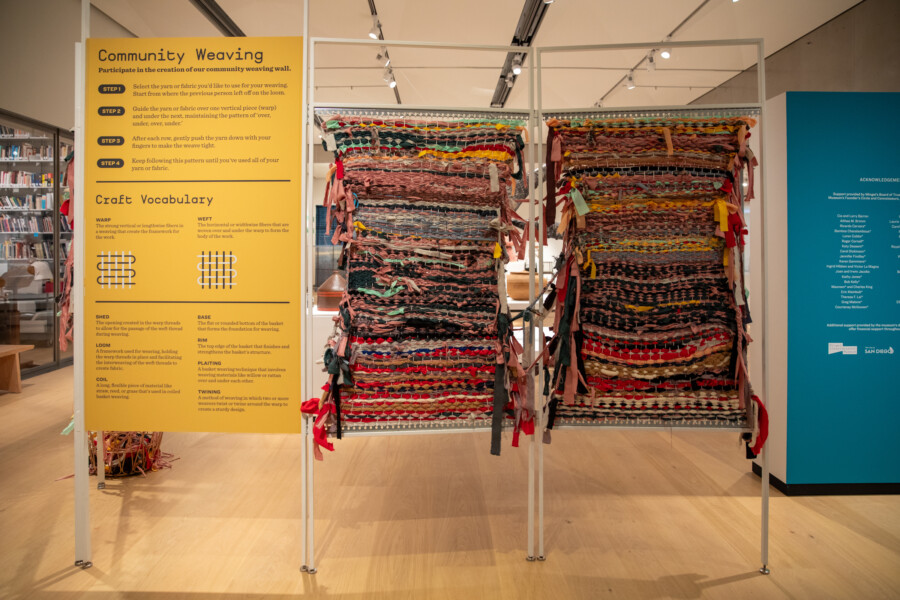 This exhibition features over 75 works, including textiles, basketry, garments, hats, toys, jewelry, and more. Examples include giant fish traps from the Philippines, a Japanese silkworm basket and traditional woven rain boots, and Egyptian woven textiles. Local makers include Kumeyaay artist Eva Salazar, weaver Sarah Winston, and others.