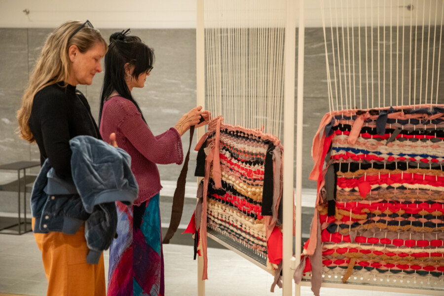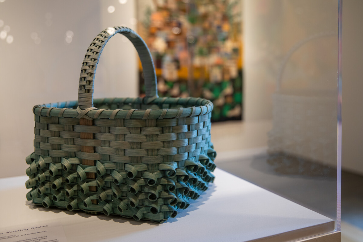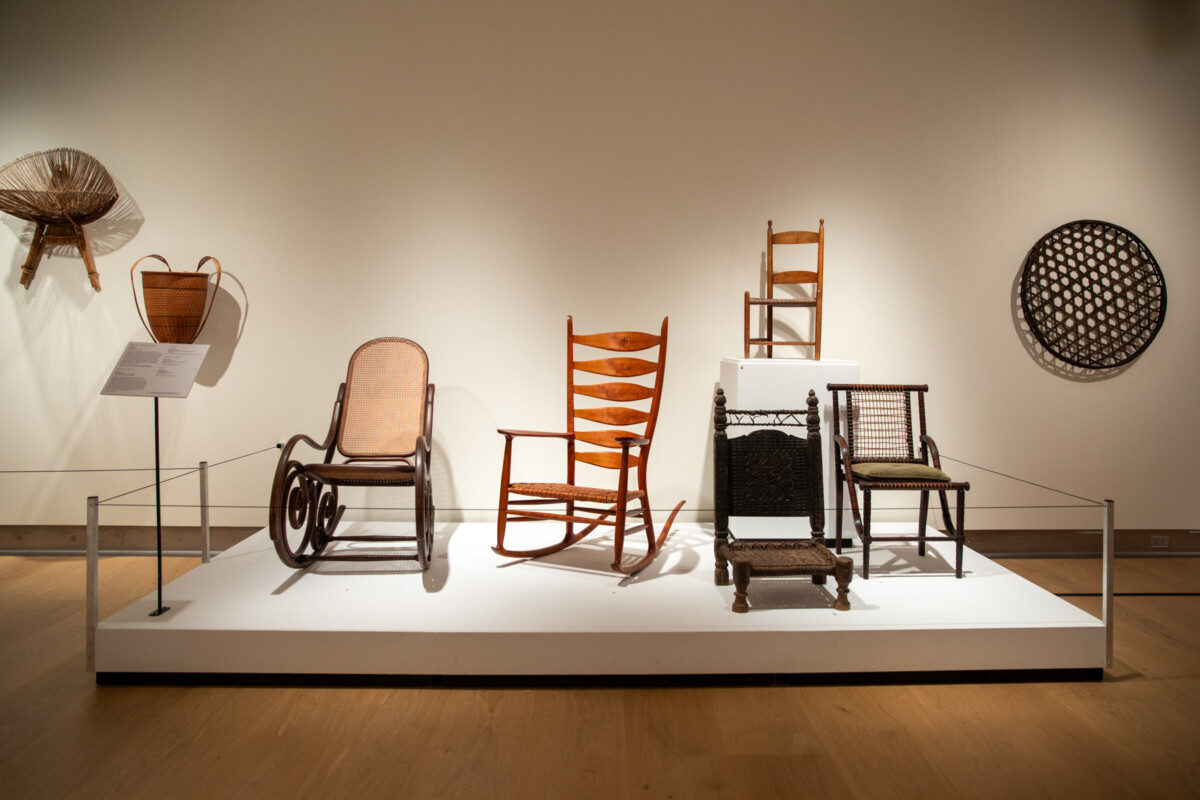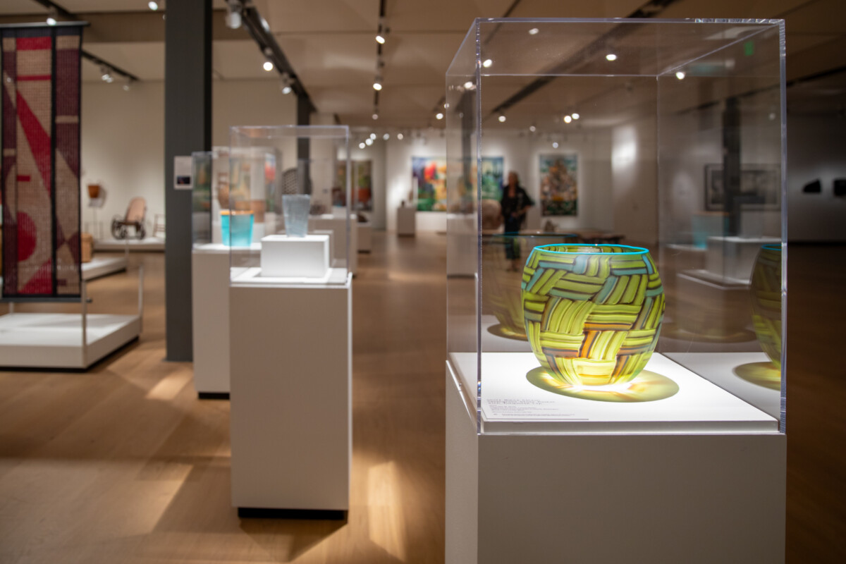 This exhibition features over 75 works, including textiles, basketry, garments, hats, toys, jewelry, and more. Examples include giant fish traps from the Philippines, a Japanese silkworm basket and traditional woven rain boots, and Egyptian woven textiles. Local makers include Kumeyaay artist Eva Salazar, weaver Sarah Winston, and others.