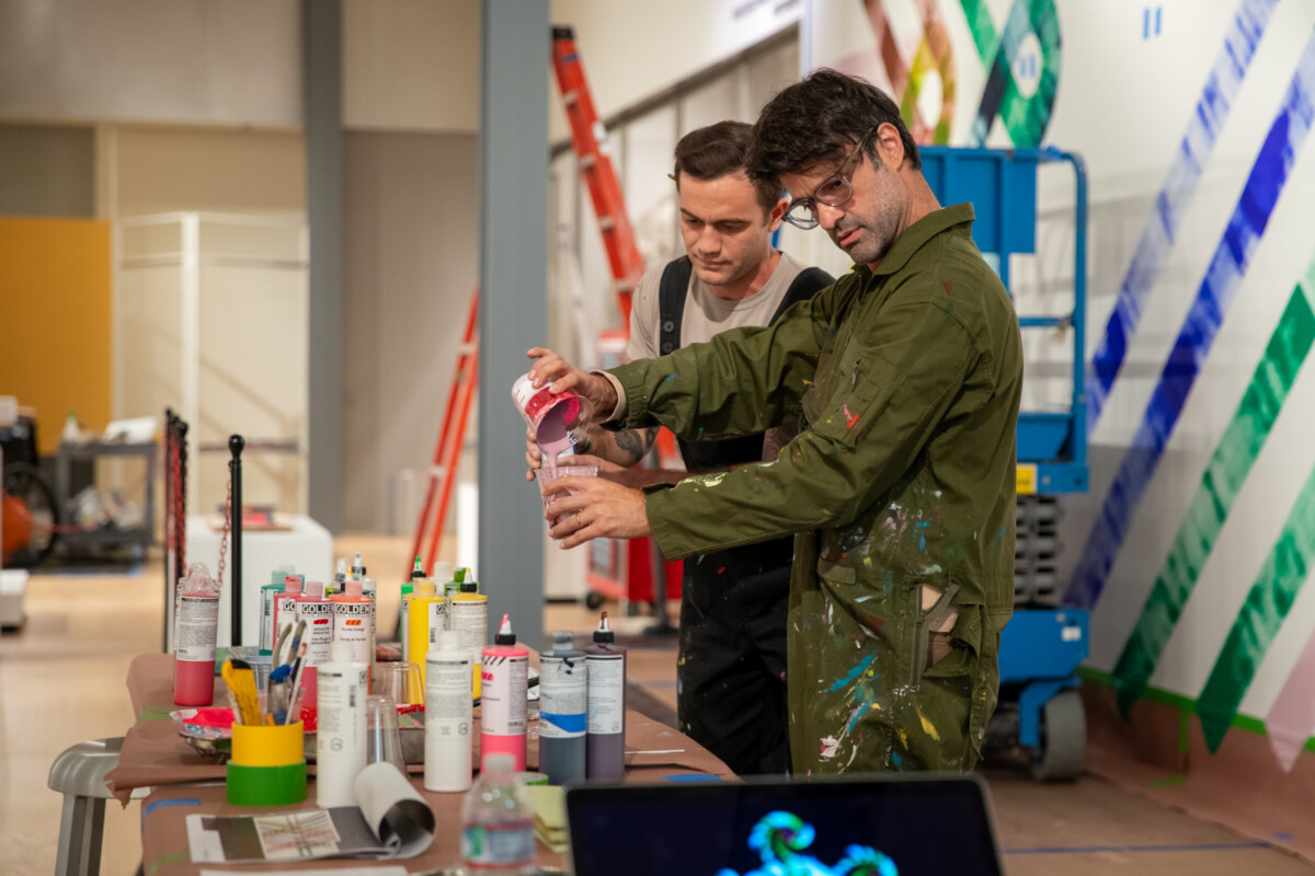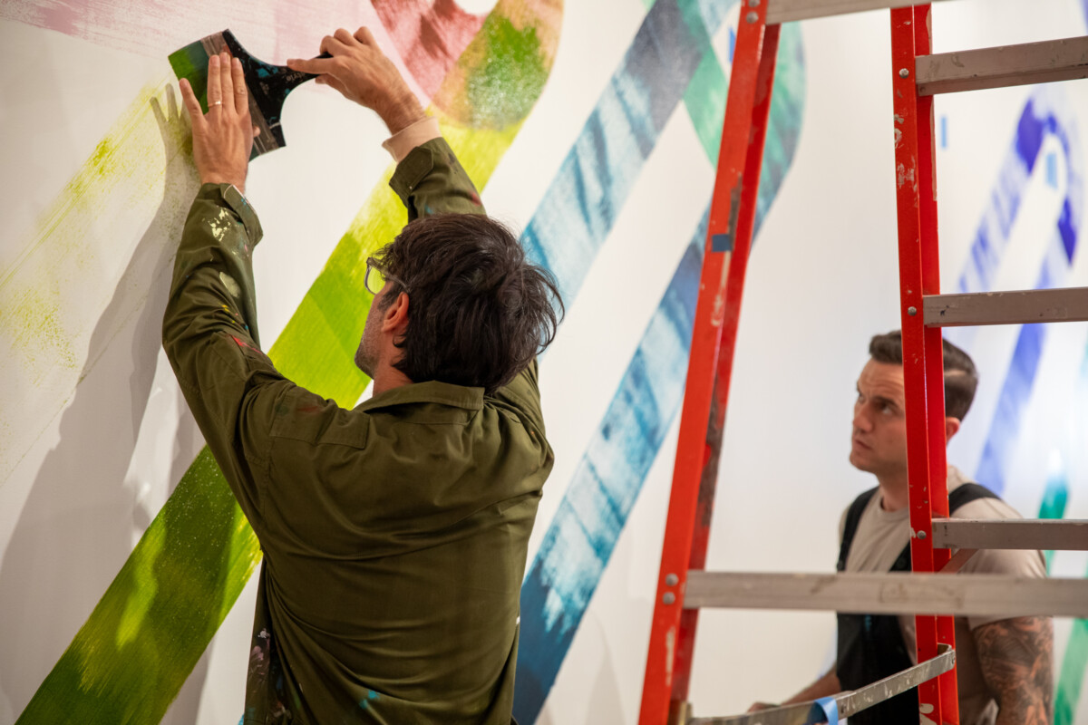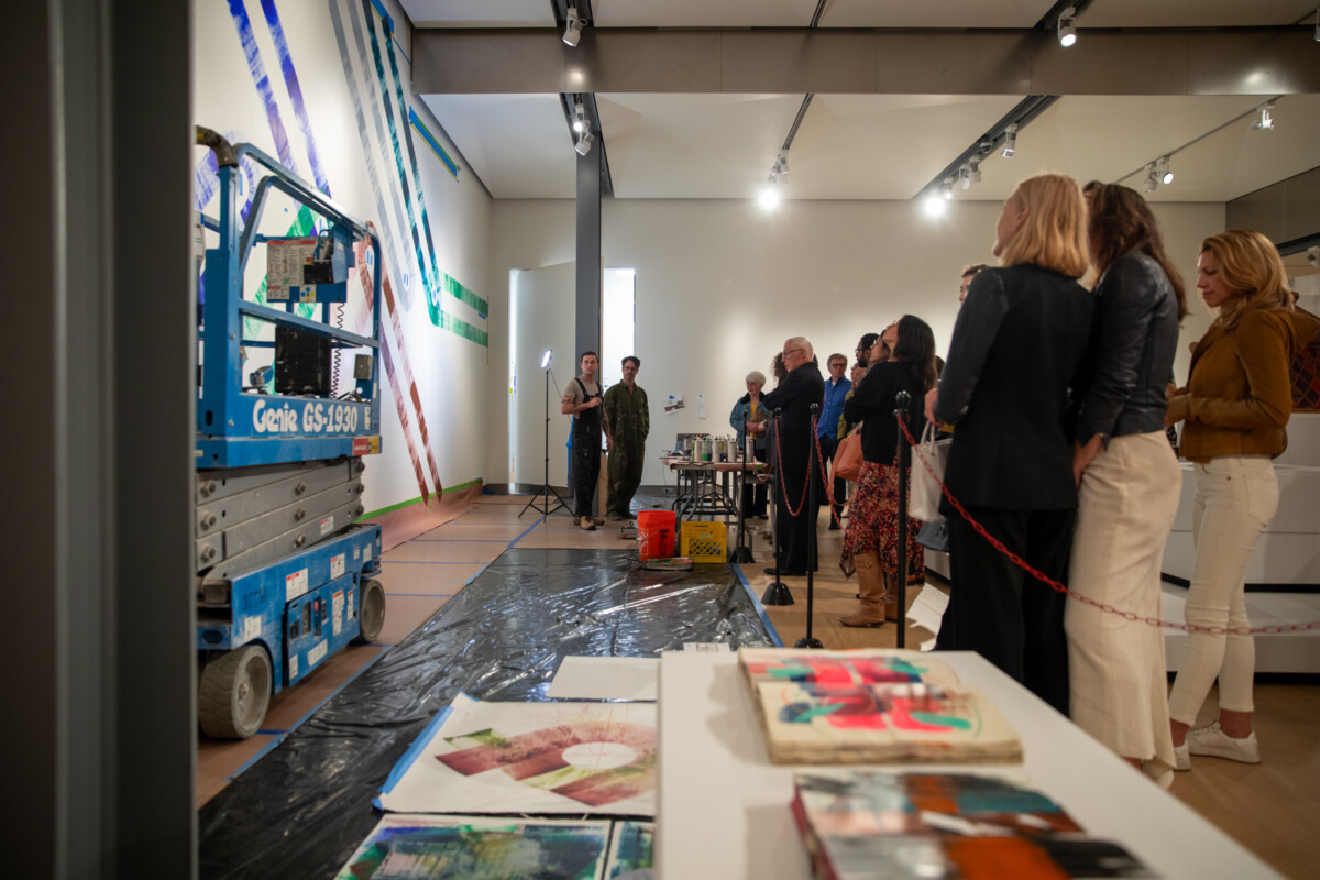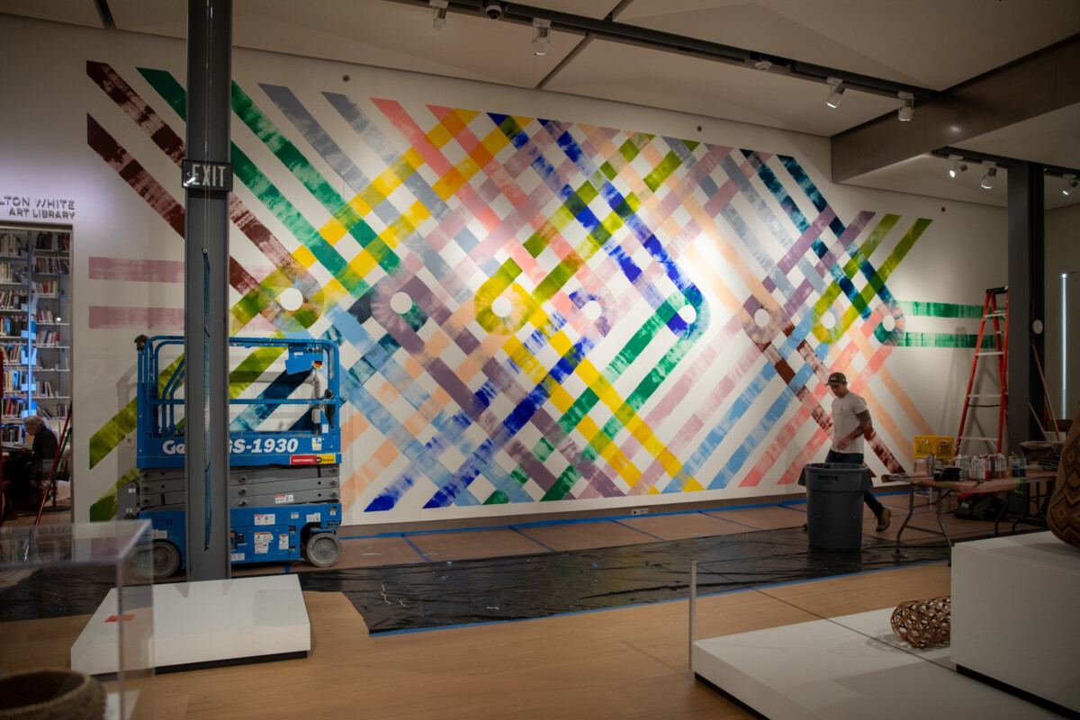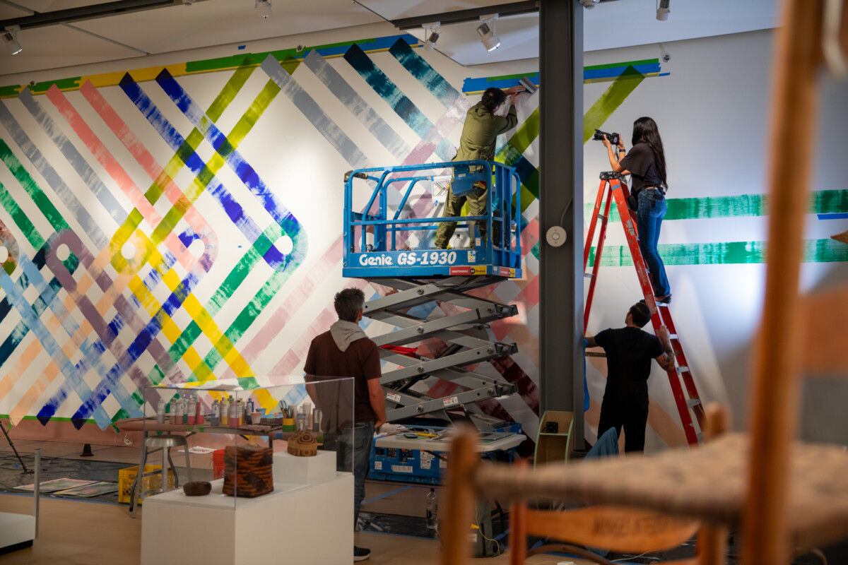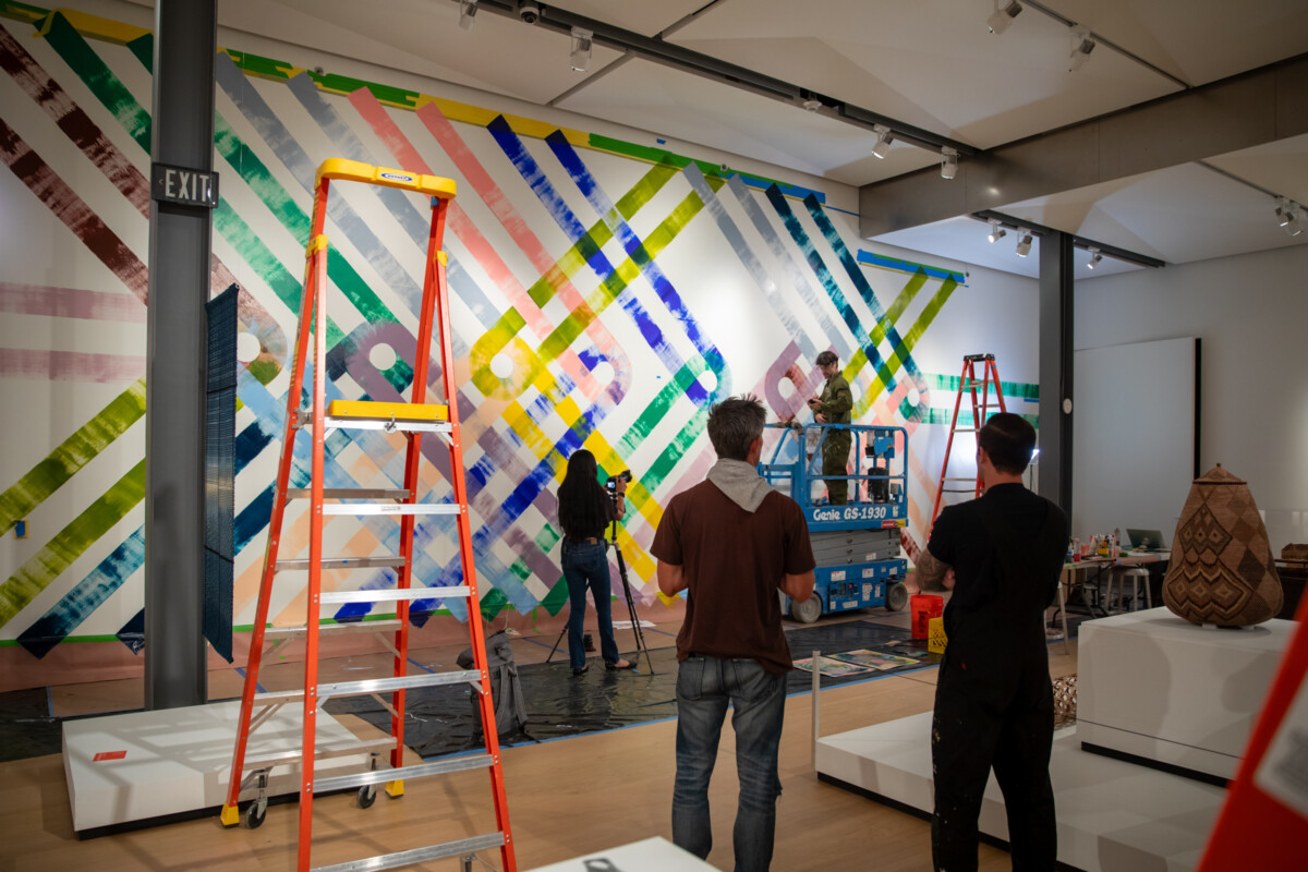 As part of the exhibition, Over/Under: Woven Craft at Mingei San Diego artist Yomar Augusto painted a large mural inside the Museum. Augusto's lyrical, linear paintings evoke woven forms, and visitors were invited to watch Yomar paint the mural live in the Gallery.