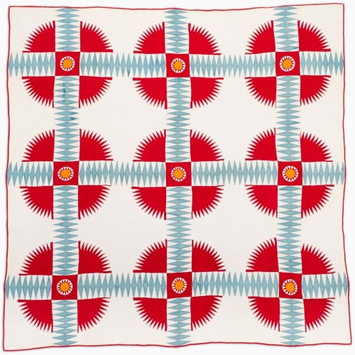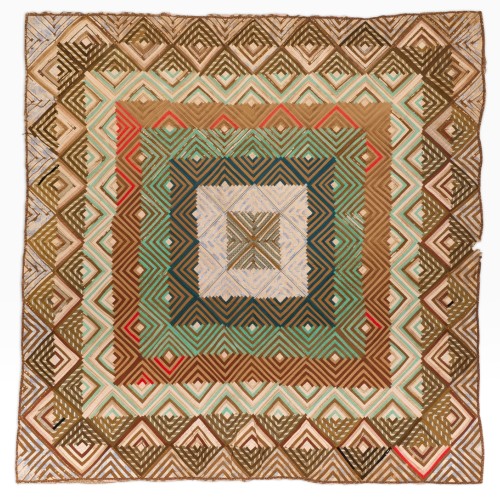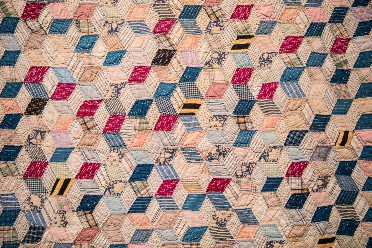 This quilt is made from little scraps of fabric, requiring expert sewing skills by its maker because of the many small stitches and the intricate saw tooth outlines.