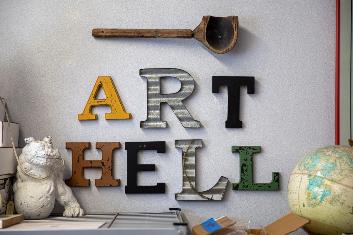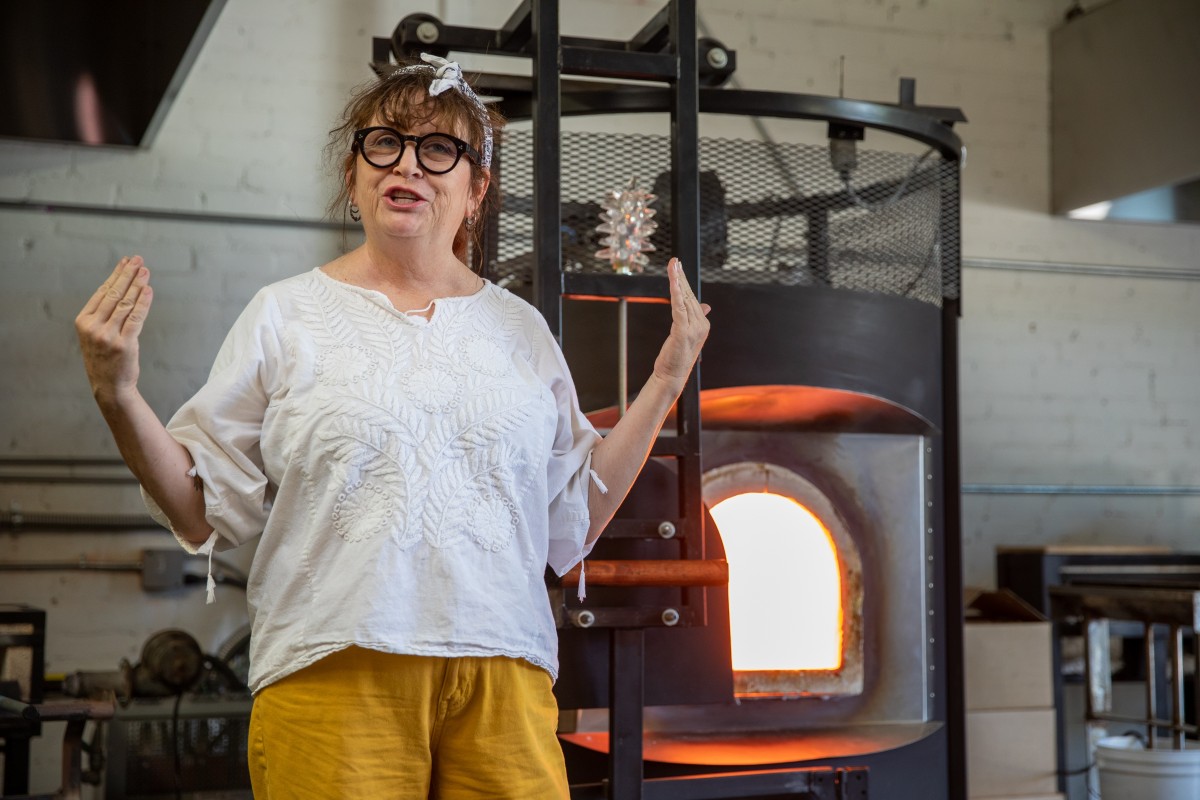 Kathleen Mitchell Glass resides in Bread and Salt. At first it was a pure empty rectangle, but she worked with the owner and the city to create the studio it is today. We met Kathleen there on a hot day made hotter by the equipment including a furnace running at 2,100 degrees, a temperature Kathleen referred to as, “pretty warm.”