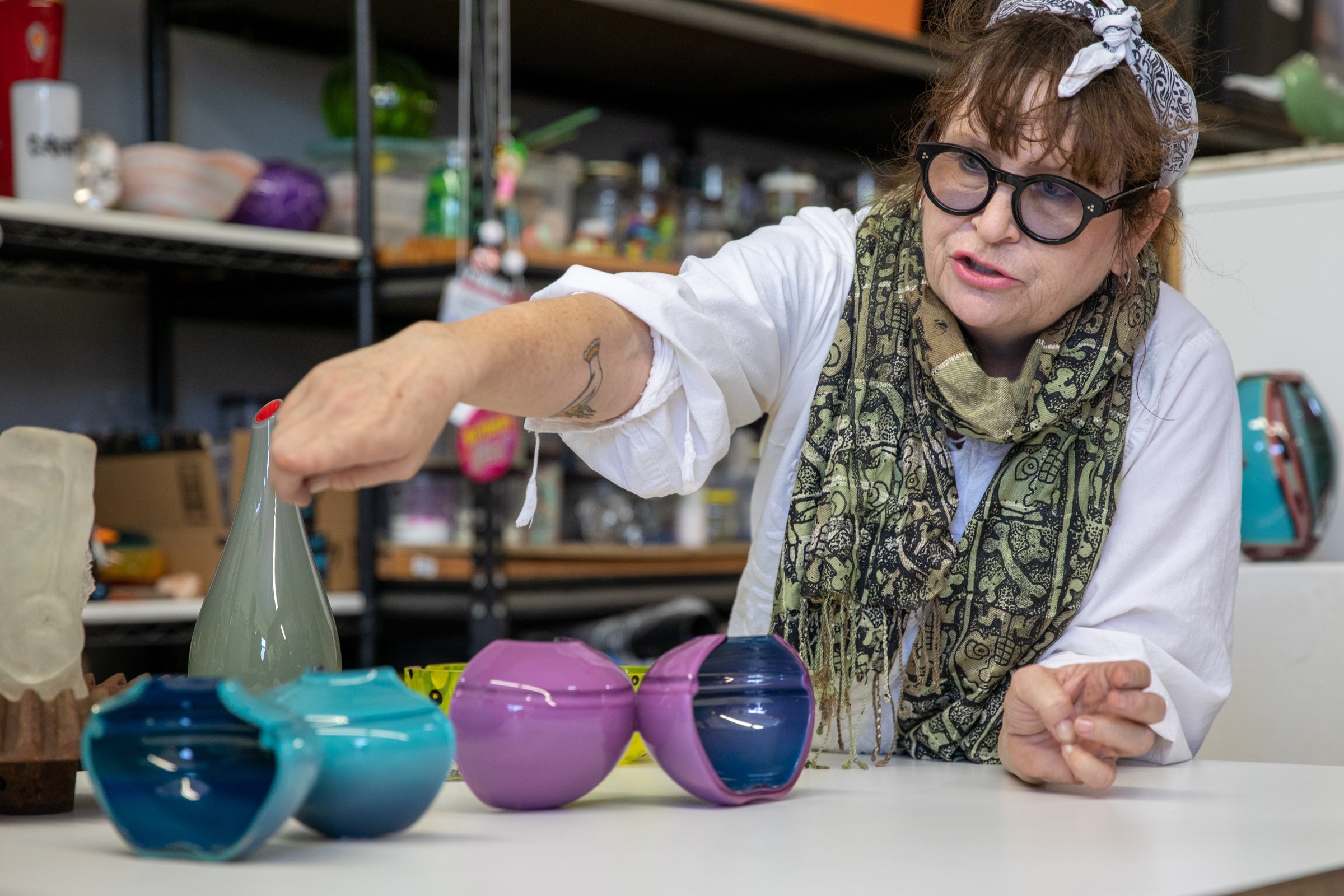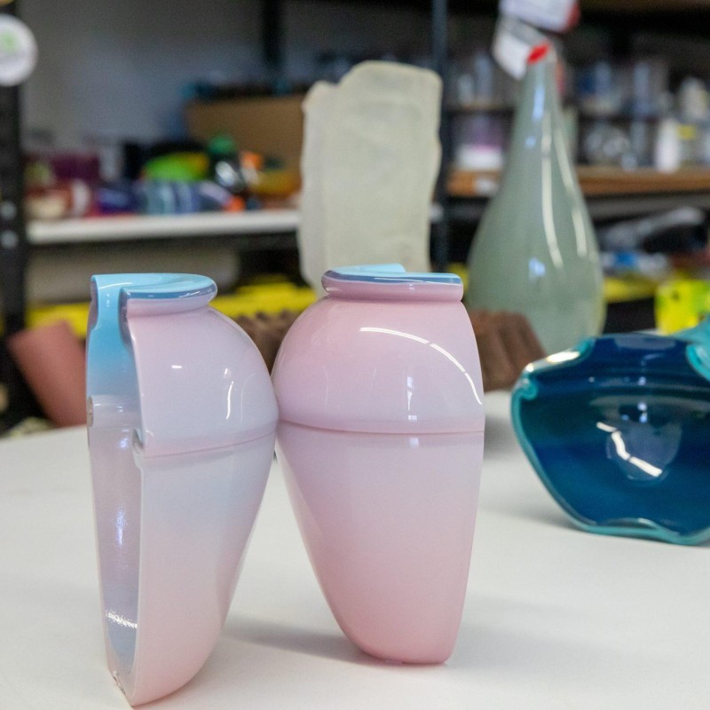 I wanted a craft object to convey my feelings about the word metamorphosis. I have a piece that I started decades ago that is actually named Metamorphosis. When contacted about the show I said, “Where is that piece where is that piece, I know I made that piece!” I got to thinking about these heads that I cast about 35 years ago and put them on the cog maybe 10-15 years ago. I started looking at it and to me it was very external. What I wanted to do was discuss metamorphosis as a more internal thing. So I started looking at deconstructing vessels. These ideas were already happening in my head when you guys reached out to me. It’s kind of crazy! The vessels are blown with the RISD (Rhode Island School of Design) ring, cooled, sliced in half and then glued together "backwards" to expose the inside. The ring is called the RISD ring because it was something that people started at RISD in the 80’s.