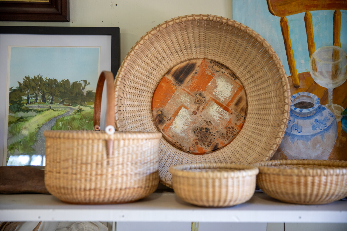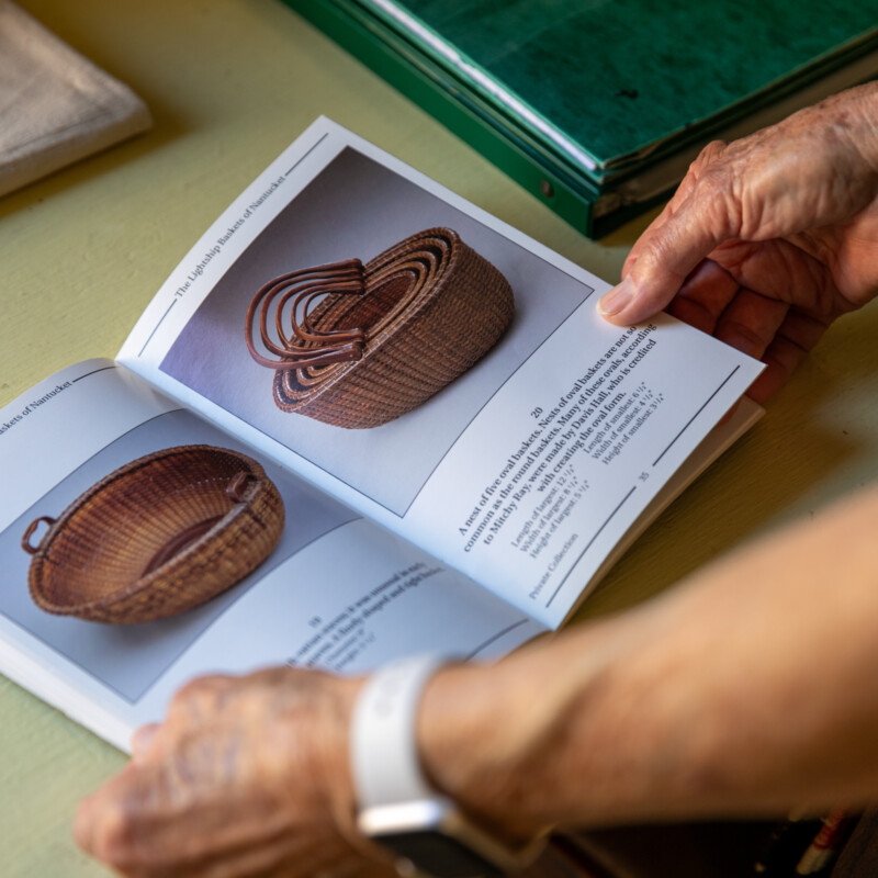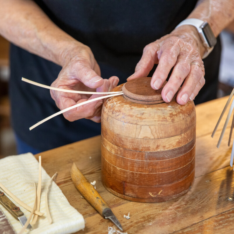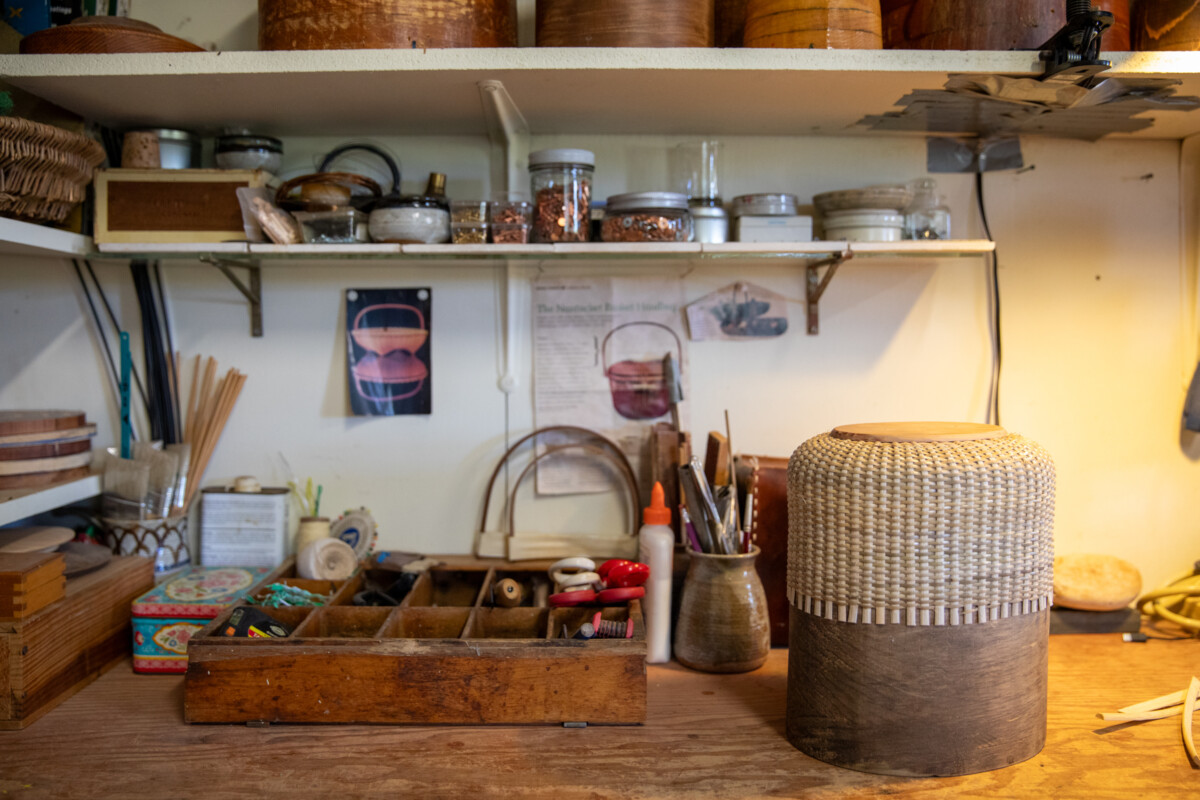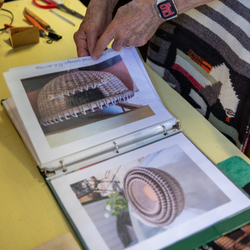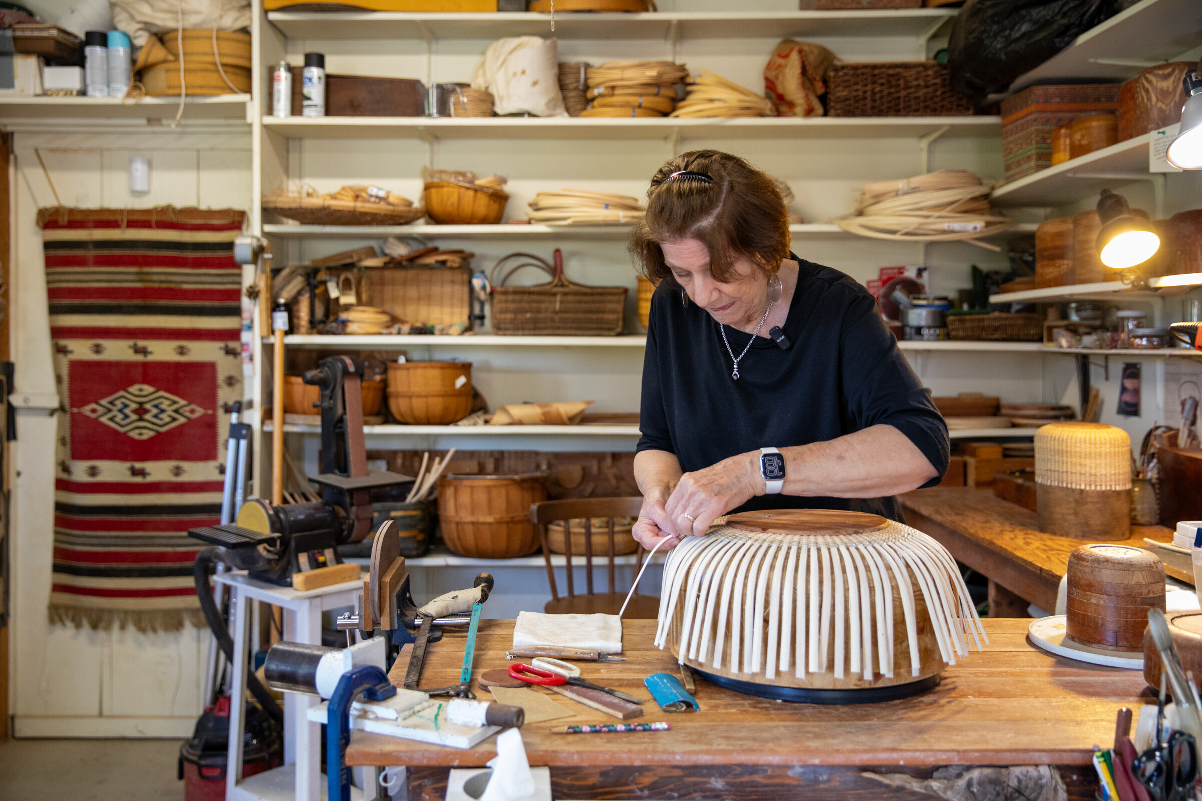 Inside the Design CenterBasket weaver Joan Laib talks as she works in her home studio, hands fluttering over a mold—the beginnings of a deep Nantucket-style basket taking shape. Between our conversation and the soundtrack of birds out the open window, she peppers in a “Come on baby,” here and there, talking to her damp cane as she winds them around the ribs. "The weaving is the easy part, in my opinion. And it's the most meditative. You can just zone out.” Joanie picks up the handsaw she uses to make grooves for the traditional wooden bottom, pointing out a piece of soft flannel wrapped around it, secured with an oversized safety pin. “My mom put this on there. Isn’t it cute? I change the blade, of course, but I leave this on.”