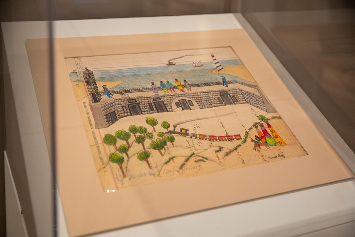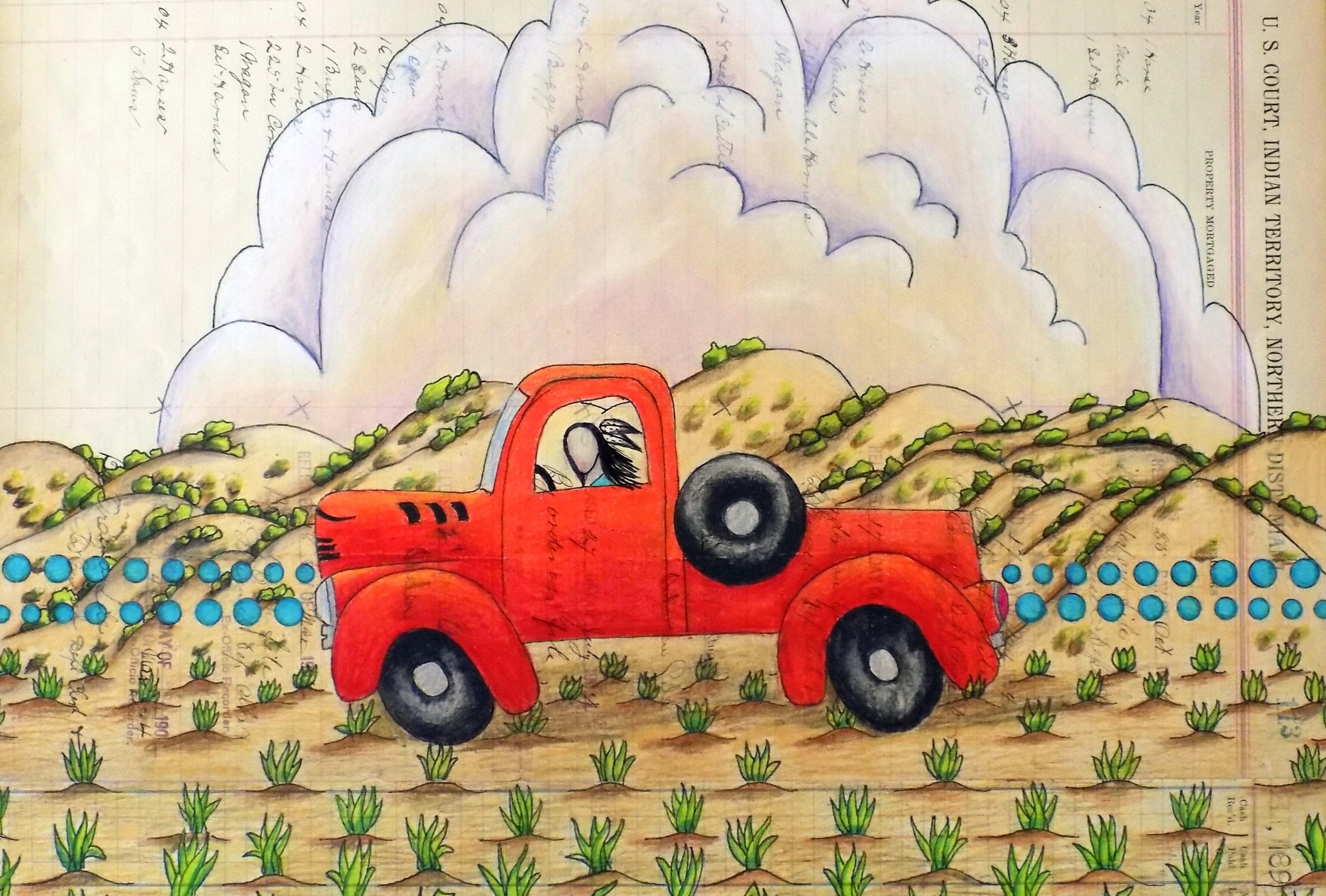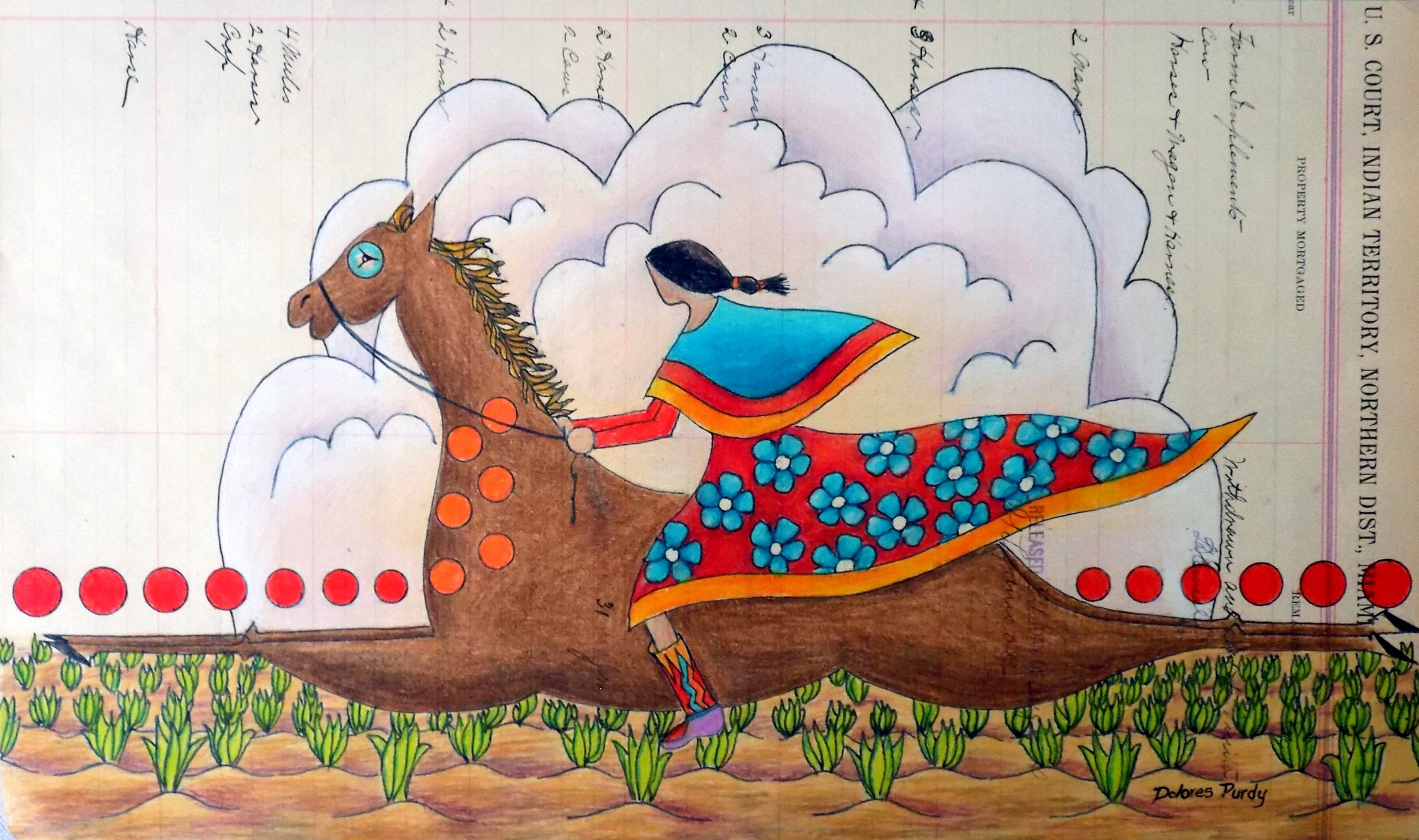 Dolores Purdy: My tribe, Caddo Nation, (I am also descended from a Winnebago woman) were not known for ledger art. In fact, they were considered to be among the first potters. Our homelands were east of the Comanche homelands, and we are considered a mixture of both Southern Plains and Southeastern culture. We engage in the Ghost Dance. Caddo men were, and still are, roadmen for the peyote practice. Sitting Bull visited us to teach the ghost dance. We were not migratory and were farmers living in grass houses. We have cultural influences from both Southern Plains and SE culture. My ledger art is a way to preserve our history in a contemporary way influenced by my culture. I also use teasing and humor frequently encountered in any family reunion that takes place among the Purdy's.