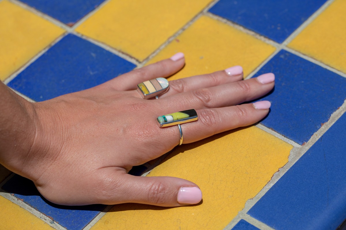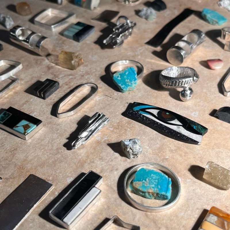 Fati Genese truly does it all. From metalsmithing to marketing, Fati cuts and carves each inlay jewelry piece by hand from raw vintage stone and then photographs her work to share on social media. We’re thrilled to have her jewelry available at Shop Mingei and to be able to ask her a few questions about her work.