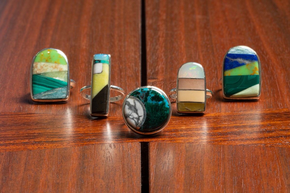 In 2011, I started my jewelry business, Sea Pony Couture. I apprenticed under a goldsmith in the Bay Area who helped me work with precious metals, high-end jewelry, and faceted stones. While working in a studio of about 70 artists, I was eager to find a way to stand out, and that’s when a friend tipped me off about an inlay class. From there, I went to Ghost Ranch in New Mexico and learned a ton about inlay, which I’ve been doing for about six years now.