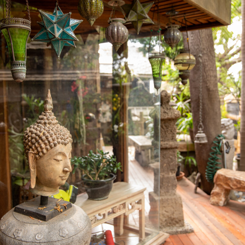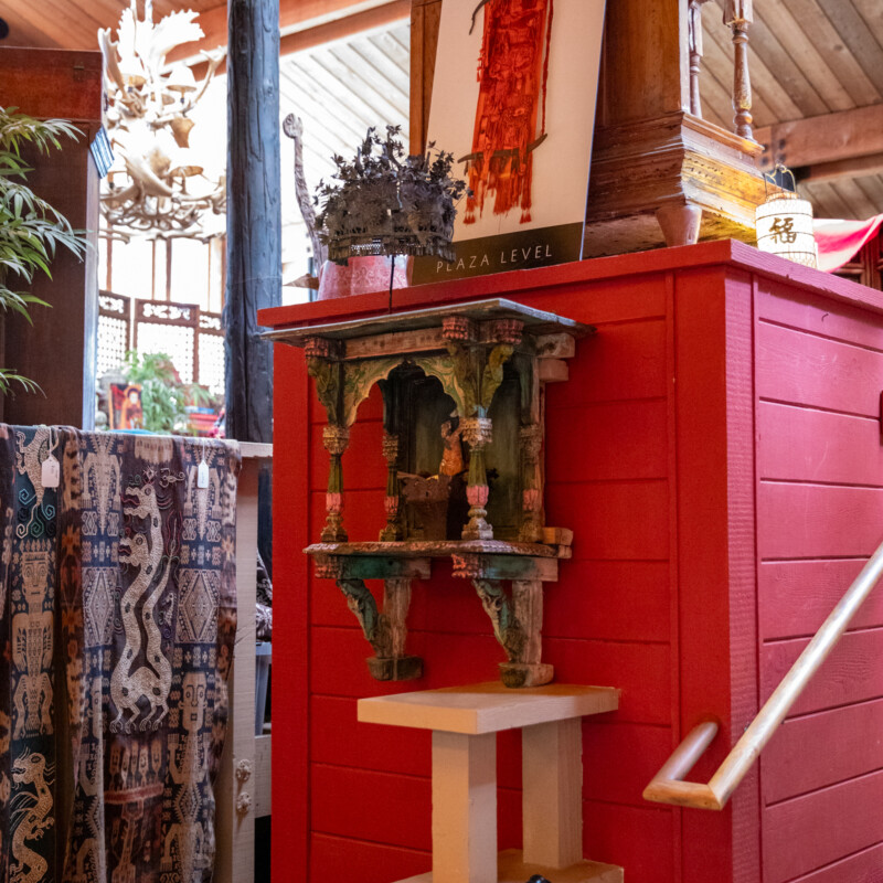 The result: a vibrant space divided by short stairs that lead to the many layers and levels of an open floor plan. Wayne’s home is full of warm-toned woods, high ceilings, and folk art from around the world.