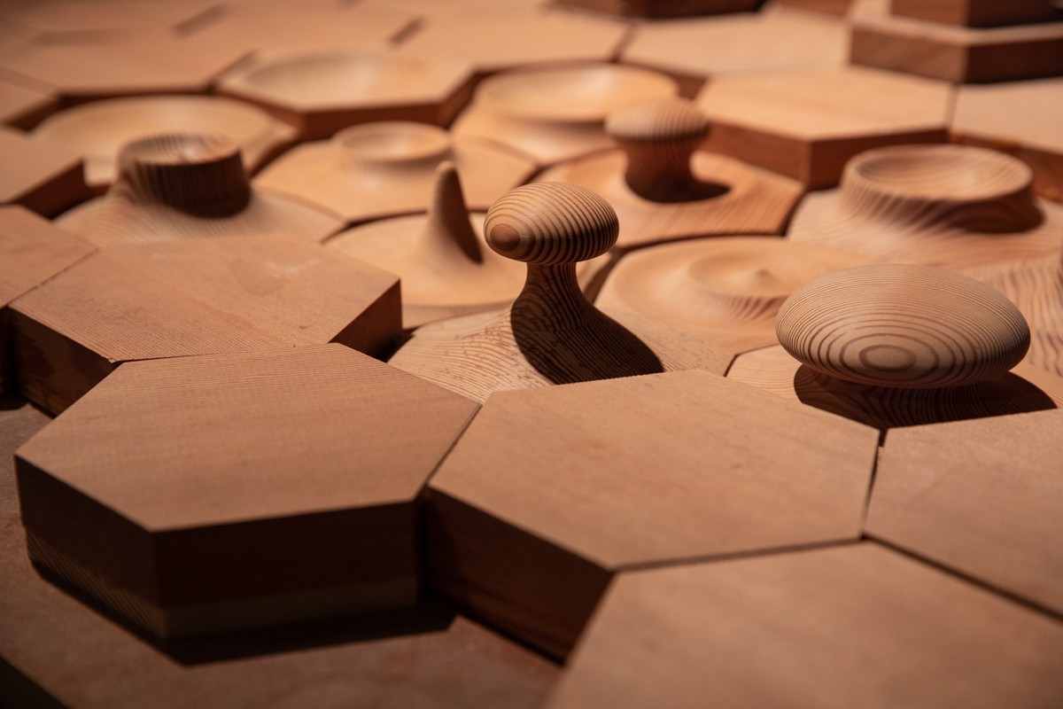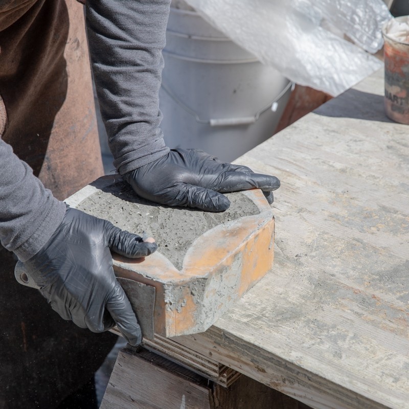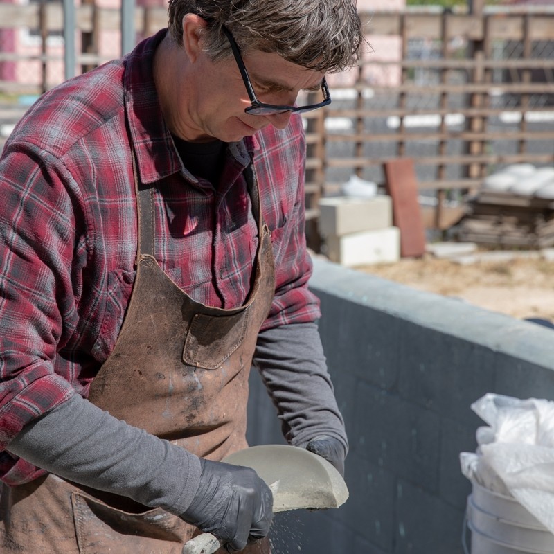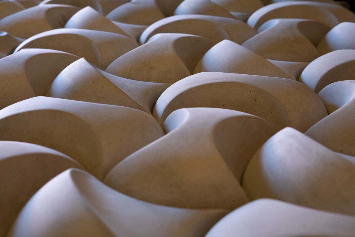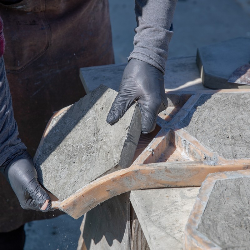 Tessellation #1 is a meditative sculptural monolith made from hand-cast tessellated concrete with an accompanying hewn beam bench set within the shade of two existing magnolia trees. The forms and fabrication processes are inspired by the legacy of crafts in San Diego. The installation provides a contemplative place to just be, experiencing the play of light, weather and time. Inset will be a bench of timber that speaks to Liberty Station’s original 1920s grand post-and-beam roof construction and the tradition of the shipwright in the legacy of naval shipbuilding. One side will be pocketed to hold plants, and the other side will be a mandala of interlocking shapes radiating out. The walls will be about 6' x 10'. It will be heavy, but modular, transported in separate cases. There are three primary shapes that fit together. The first step is R&D, to understand how the volume will sit in the space and how it will work with the trees to develop a full-size maquette in paper.