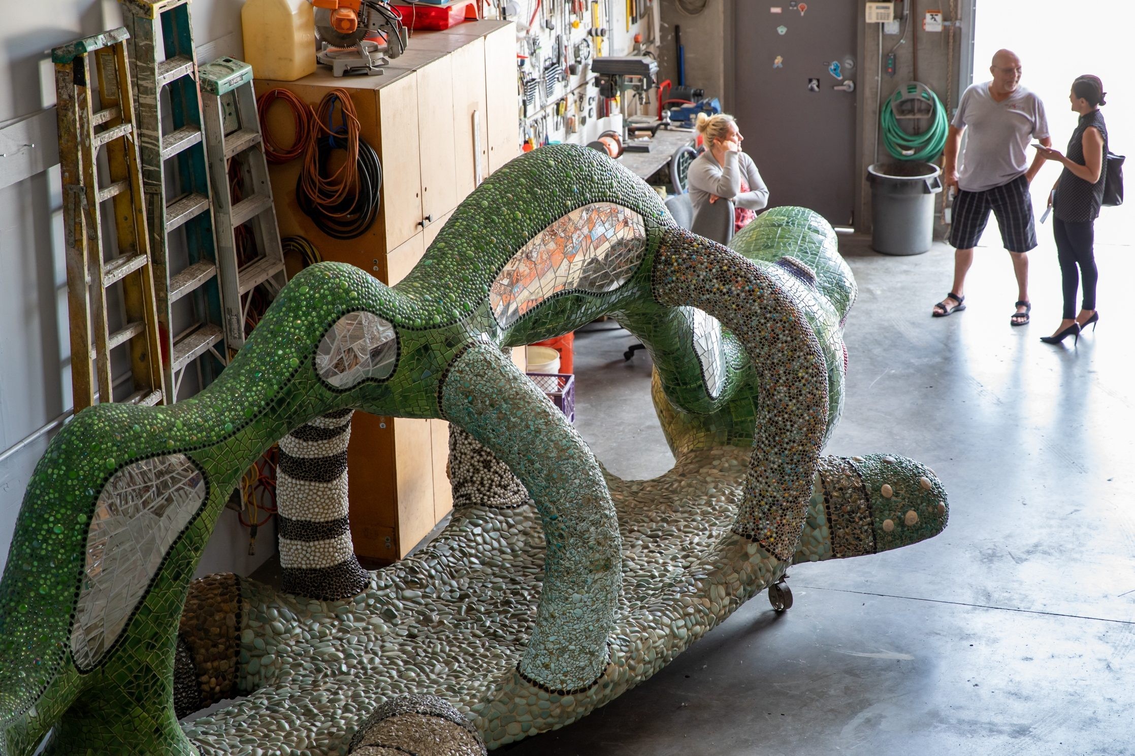 Nikigator weighs 5,000 pounds, and the stones used come from all over the world—the marbles were made in Guadalajara and the turquoise in the U.S. I remember the excitement we all had, too, when we first brought the metal skeleton of Nikigator to Balboa Park. Niki and I met with Martha, Marcelo and (Mingei Executive Director & CEO) Rob Sidner to figure out her placement.