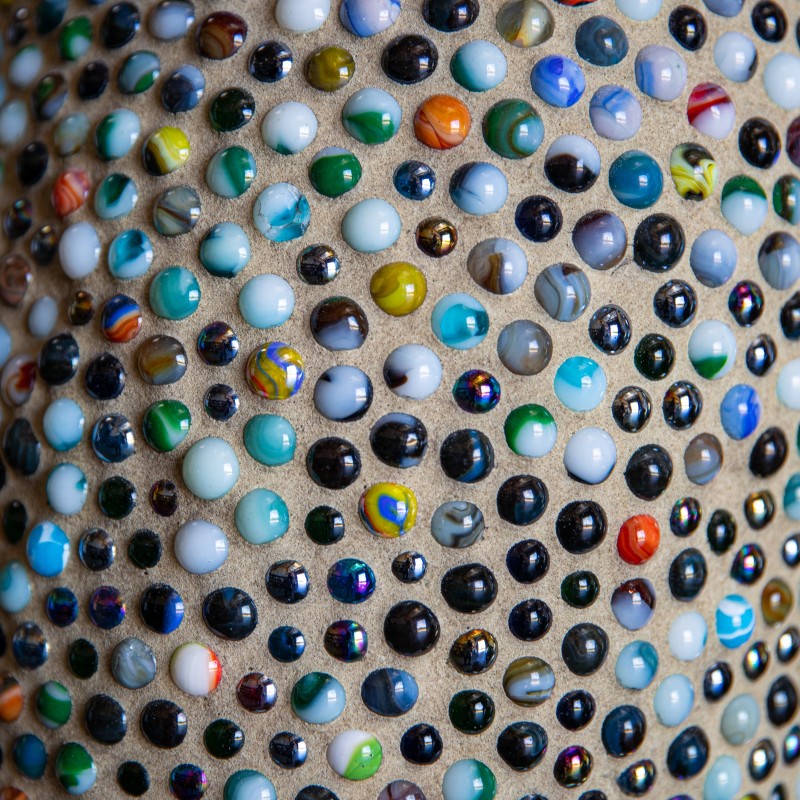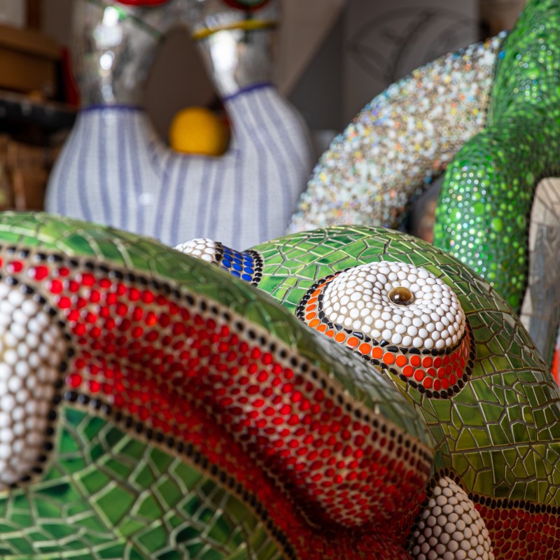 Can you tell us about the sourcing of materials for the mosaic sculptures?