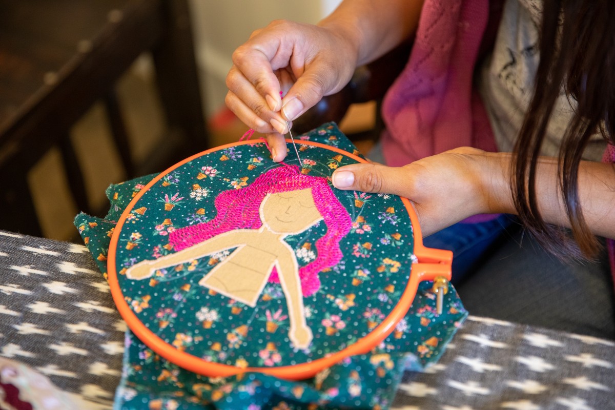My great aunt taught my mom and my mom’s sisters how to stitch. Then, when I was eight, my mom and aunts taught me my first stitches. I became obsessed! My mom would say, “It’s too early to learn how to sew. You’ll hurt your eyes.” But I would risk it and sew constantly. If I was ever in trouble, my crochet hooks were taken away because my mom knew they were the most valuable thing to me.