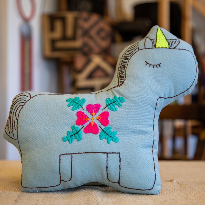 Currently, I am enjoying working on children's toys and soft sculptures. I’ve been reading about handmade, hand crafted toys for inspiration and I also took a professional development class with Mingei and taught a workshop which kid of blossomed into what I am currently doing. At this professional development, Mingei’s education specialist and friend, Charles, was working with stuffed alebrijes, so I used his patterns to figure out the dimensions for my toys and then use the weaving embroidery technique to create the animal and mermaid motifs. The mermaids came from a workshop I did a while back with Shannon on some of the Mexican Mermaids in the Museums collection. I'm interested in finding the simplest structure and embellishing it with embroidery. Safety is also a big concern of mine when making these toys. Working at a children’s museum safety is always on your mind, so when I was making these toys I did research into toy production regulations. I don’t include embellishments like buttons or things that can be a choking hazard. It is important to me that the toys are both lovable and safe.