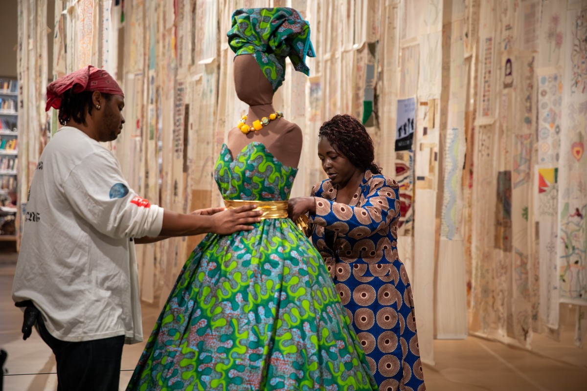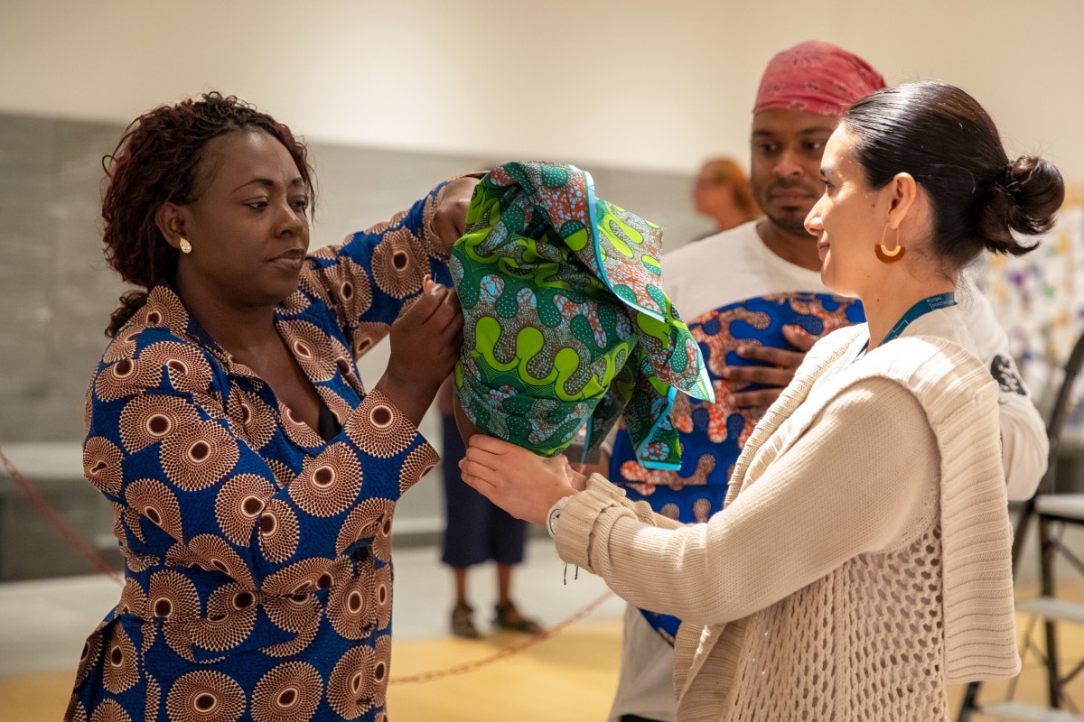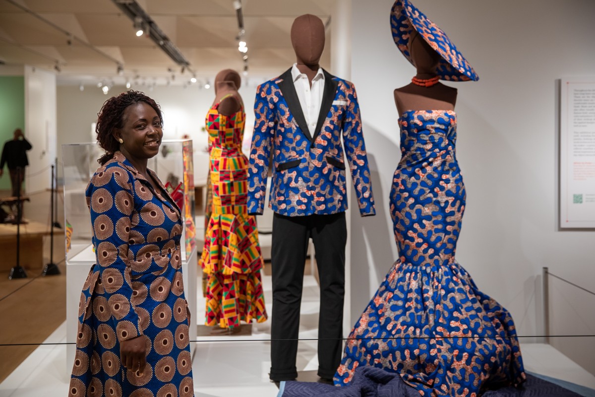 One of the fantastic makers featured in this exhibition is fashion designer Lalitibe “Lili” Lare. Lili was born in Togo, West Africa, and arrived in San Diego over twenty years ago. She is the owner of Lili Kouture, a dress shop selling African clothing, which has been a fixture in City Heights for years. Educated at College St. Joseph in Lome, Lili (who had been trained to follow a pattern) began designing her own clothes and creating her own patterns. Her garments have been featured in numerous fashion shows, including The Fall Fashion and Auction Show at the Hilton Hotel in Mission Valley, San Diego Fashion Week, RAW Fashion Week in Los Angeles, and The Hollywood & African Prestigious Award (HAPAWARDS) Foundation in Hollywood, CA, where she was a nominee for best African Designer.